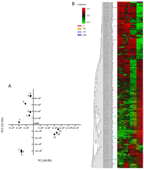 Figure 2. Results of PCA analysis and clustering analysis of liver protein profiles in four treatment groups of mice. (A) PCA of non-targeted metabolite profiling in liver using EASY-nLC coupled with Q-Exactive. The points 1, 2 and 3 in the diagram indicate group C; points 4, 5 and 6 indicate group CB; points 7, 8 and 9 indicate HF group and points 10, 11 and 12 indicate group HFB. (B) Heat map analysis of differential protein expression in the four groups, red and green indicate high and low concentrations of protein, respectively.