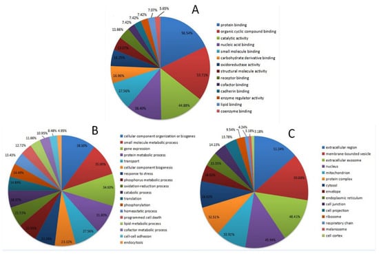 Figure 3. Results of GO analysis of differential proteins in HF group and HFB group. Molecular functions (A), biological processes (B), cellular functions (C).