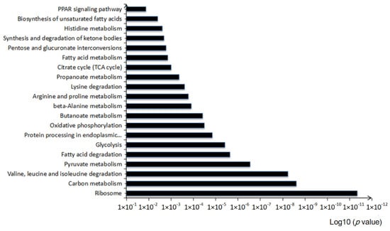 In the KEGG pathway analysis, 78 pathways were enriched. The KEGG pathway analysis of the identified proteins showed that these pathways were mostly related to 20 KEGG pathways (p < 0.05), including carbon metabolism, fatty acid degradation, the TCA cycle and PPARα signaling pathway (Figure 4).