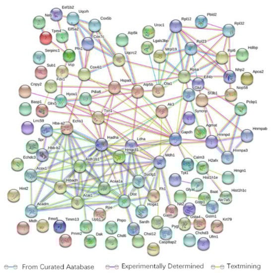 The results of the PPI analysis revealed a protein network comprising 99 points (proteins) (Figure 5). When we combined the KEGG pathways and protein association networks, the following hubs were involved in multiple pathways: hydroxyacyl-Coenzyme A dehydrogenase (HADHA), enoyl-coenzyme A hydratase (ECHS1), glyceraldehyde-3-phosphate dehydrogenase (GAPDH), succinyl-CoA ligase subunit alpha (SUCLG1), 3-ketoacyl-CoA thiolase A peroxisomal (ACAA1), acetyl-coenzyme A acetyltransferase (ACAT1), apolipoprotein A2 (APOA2) and acyl-coenzyme A oxidase 1 (ACOX1). In the protein network, ACAT1, HADHA and ECHS1, which served as the central hubs, exhibited more interactions than the other proteins. Interestingly, those three proteins mentioned above were also upregulated in the HFB group and were directly linked to the other changes in the proteins we identified.