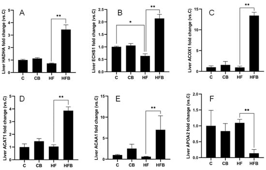 Figure 6. The relative expression HADHA (A), ECHS1 (B), ACOX1 (C), ACAT1 (D) and ACAA1 (E), APOA2 (F), as measured by MS protein profiling. The results are expressed as means ± SEM of the relative peak areas. * p < 0.05, ** p < 0.01.
