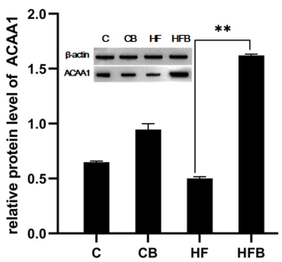 Figure 8. Verification of the expression of liver protein in the different groups. The Western blot bands of ACAA1A. Actin was used as reference. ** p < 0.01.