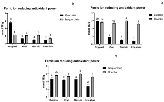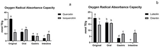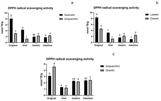 The DPPH assay result of flavonoids during in vitro digestion are shown in Figure 2. In a and b, the original antioxidant activity of aglycones (both quercetin and luteolin) were very high. However, during the digestion process, they were significantly reduced and gradually lowered than their glycosylated compounds (both isoquercitrin and orientin). This was consistent with the results reported by Lee [28]. Because the instability of the aglycones leads to a rapid decline in contents during the digestion process, their activity was rapidly reduced. For isoquercitrin (O-glycoside) and orientin (C-glycoside), they maintained a relatively high activity compared to their original activity and were significantly higher than their aglycones in the intestinal stage. Glycosylation will reduce the activity while improving the stability of the compound. Therefore, glycosides can easily maintain relatively stable activity in vitro digestion. It showed that the influence of glycosylation on the stability of flavonoids is significant. It can be seen from Figure 2c that the activity of O-glycoside and C-glycoside showed no significant difference during digestion. The activity of flavonoid glycosides decreased in the oral phase and increased in the gastric and intestinal phases. Similar variations were found in bamboo leaf soup, which is full of flavonoids [25,29]. This may be due to the fact that the content of flavonoids decreased a lot in the oral digestion phase, thus, leading to the reduction of antioxidant activity. In the gastric and intestine phases, the content of flavonoids tended to be stable. Meanwhile, the acidic environment in gastric digestion was conducive to the stability of flavonoids [30], consequently, the content and activity of flavonoids were improved.