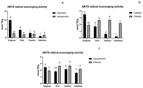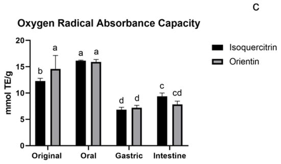 As for the ABTS assay (Figure 3), in original, the aglycones’ (both quercetin and luteolin) activity were significantly higher than their glycoside compounds (isoquercitrin and orientin), but their activity decreased sharply during the digestion process and was even considerably lower than their glycosides in the intestine as shown in Figure 3a,b, which was similar to the DPPH assay. However, compared with their original activity, flavonoid O-glycoside and C-glycoside maintained vigorous antioxidant activity in the oral, gastric, and intestinal stages, especially flavonoid C-glycoside. The antioxidant activity of C-glycoside (orientin) was significantly increased during the digestion process than in the initial stage. Similar results were reported by Bouayed and Lucas that the ABTS activity of Jonagold apple and the chyme soluble fractions of spaghetti increased during in vitro digestion [31,32]. This may lie in the interaction between the digestive system and compound, which also helps to scavenge ABTS radicals. The activity of flavonoid C-glycoside was significantly higher than that of flavonoid O-glycoside during the digestion process, as shown in Figure 3c. This may be a reflection of the more stable structure of flavonoid C-glycoside, which made it easier to maintain higher activity.