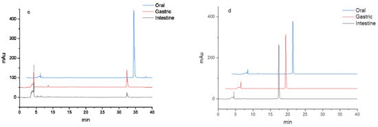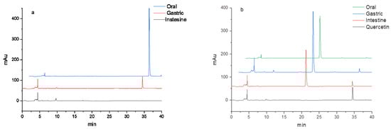 To detect the content changes of flavonoid O-glycoside, C-glycoside, and their aglycones during in vitro digestion, the digested compounds were analyzed by HPLC. The results are shown in Table 1 and Figure 6. It was shown that the contents of two aglycones, quercetin and luteolin, decreased rapidly after digestion in the oral, gastric, and intestine and were even reduced beyond the detection limit in the intestine. This was mainly because aglycone compounds were unstable and degraded rapidly due to digestive enzymes and digestive fluid, which were also consistent with their activity changes. Pellegrini reported that the content of quercetin decreased significantly during digestion [41]. At the same time, O-glycoside isoquercitrin and C-glycoside orientin maintained relatively high contents during digestion, confirming the stability of glycosylated compounds. Because the additional sugar moiety can protect the aglycones from degradation to some extent [11]. Xiang et al. also reported that the stability of myricitrin was greater than that of myricetin [42]. In the gastric and intestine, the quercetin could be detected in isoquercitrin by HPLC, which proved that the O-glycoside was broken down, and the isoquercitrin was deglycosylated into the aglycone quercetin. However, there was no luteolin detected in orientin. O-glycoside was easily damaged by hydrolysis. However, C-glycoside is a more stable structure, and the C–C covalent bond is hard to break. The content of C-glycoside in the intestinal stage was higher than that of O-glycoside, which also reflected that the stability of C-glycoside was higher than that of O-glycoside. In general, the content changes of O-glycoside, C-glycoside, and their aglycones during in vitro digestion correspond to their activity changes, which is related to their respective structural characteristics.