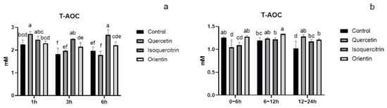 Changes of total antioxidant capacity of flavonoids in plasma and urine: (a) plasma and (b) urine. The results are reported as means ± SD. Different letters in the figure indicate significant differences (p < 0.05).