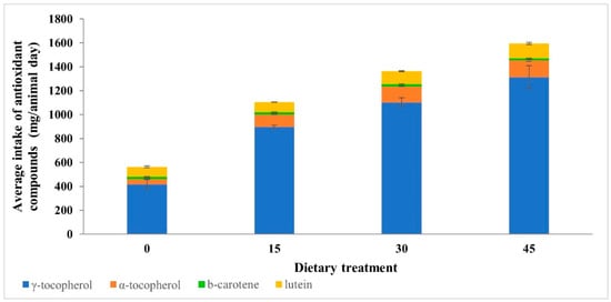 To estimate the vitamin intake of the animals, the composition of the feeding diets was weighted with the consumption of animals (Figure 1). The DM consumption of repetitions and treatments was measured every other week [20] and an average of consumption was calculated for each diet: 8.64 DM/day for 0DG, 8.77 DM/day for 15DG, 8.31 DM/day for 30DG, and 8.17 DM/day for 45DG. No statistical analysis was done on these data since DM intake was recorded on a group basis. Results showed that the intake of antioxidant compounds, except for that of β-carotene, numerically increased with the level of DG inclusion in the diets.