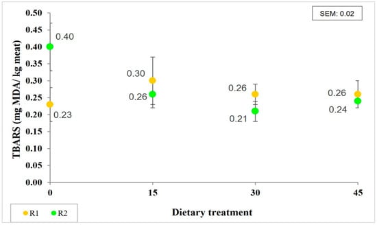 The TBARS assay is used as a marker of lipid oxidation and as a predictor of the perception of rancidity in meat. In different studies, values of 2–2.5 mg MDA/kg have been established as the accepted limit at which meat shows no rancidity [6]. In our study, all the TBARS values observed were below that threshold.