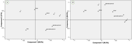 Moreover, a PCA was performed to depict the relationship between the oxidant/antioxidant status and the color parameters, at each storage condition (Figure 3). The new components identify where the maximum variance of the data occurs in a multidimensional space. For the R1 condition, the first component (PC1) accounted for 29.5% of the variance, the second component (PC2) accounted for 21.0% of the variance, and the third component (PC3) accounted for 19.3% of the variance. For R2 conditions, the principal components accounted for 36.3% (PC1), 28.2% (PC2), and 16.7% (PC3) of the variance. Interestingly, it was observed that the relationship between the variables differed with the type of storage. In R1 storage, retinol and FRAP showed a positive correlation with a* and C* and a negative correlation with TBARS. In R2 storage, γ-tocopherol and FRAP showed a positive correlation with a* and C* and a negative correlation with TBARS. For both storage conditions, a* and C* parameters showed a negative correlation with TBARS.