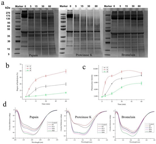 The decomposition of MP during the protease treatment was analyzed by observing SDS-PAGE (Figure 1a) images and measuring the DH value (Figure 1b). All the proteases were shown to hydrolyze MP, since the bands of the macromolecular proteins in MP hydrolyzed into smaller fractions gradually, the longer they were treated. Proteinase K exhibited the highest hydrolysis efficiency, which was followed by papain and bromelain. In addition, the enzymes presented stronger catalytic efficiency to hydrolyze larger molecules with a molecular weight higher than 200 kDa, which have been reported to consist of aggregation and myosin heavy chain [23]. By contrast, actin (43 kDa) was affected to a smaller degree, which disagreed with previous research [24] reporting that papain and bromelain showed a significant catalytic efficiency on actin. This may have been due to the use of enzymes from different brands, the diversity of isolation, and the purification method [25].