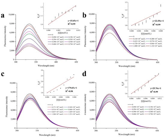 The fluorescence-quenching rate constant (Kq) was calculated according to the following formula, where τ0 refers to the fluorescence lifetime of biological macromolecules without the addition of quencher and equals approximately 10−8 s [21].