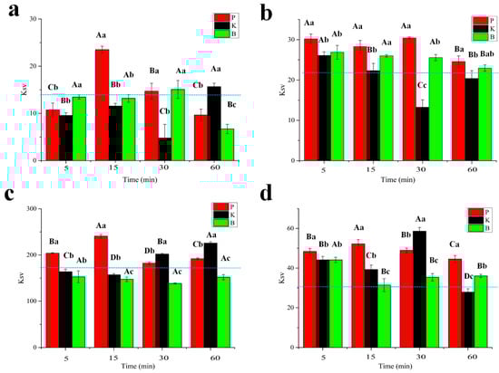 The Ksv of butyraldehyde (a), 2-pentanone (b), octanal (c), and 2-octanone (d) with MP treated by papain (P), proteinase K (K), and bromelain (B) for 0 (blue dotted line), 5, 15, 30, and 60 min. A–D indicates the significance level among the same samples treated for different times, while a–c indicates the significance level among the different enzyme treatments (p < 0.05). Each measurement was repeated in triplicate.