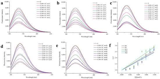 Fluorescence spectra analysis (a–e) and Stern–Volmer plots (f) of the interaction between octanal and the MP treated with papain at 0 (a), 5 (b), 15 (c), 30 (d) and 60 min (e).