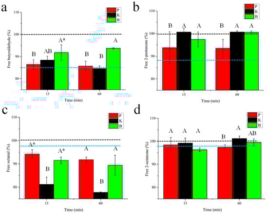 Changes in absorption of MP solution to butyraldehyde (a), 2-pentanone (b), octanal (c), and 2-octanone (d) affected by treatment with papain (P), proteinase K (K), or bromelain (B) for 0 (blue dotted line), 15, and 60 min. Uppercase letters A,B indicate significance level differences among different enzymes. Symbol * indicates significant differences between samples treated with the same enzyme for 15 and 60 min. Each measurement was repeated in triplicate.