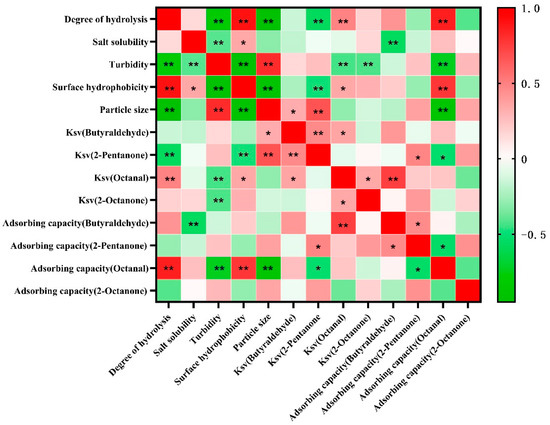 Heat map of the correlation analysis among degree of hydrolysis (DH) physicochemical properties, and Ksv. The red color represents positive correlations and green indicates negative correlations. The significance is indicated as * p < 0.05; ** p < 0.01.