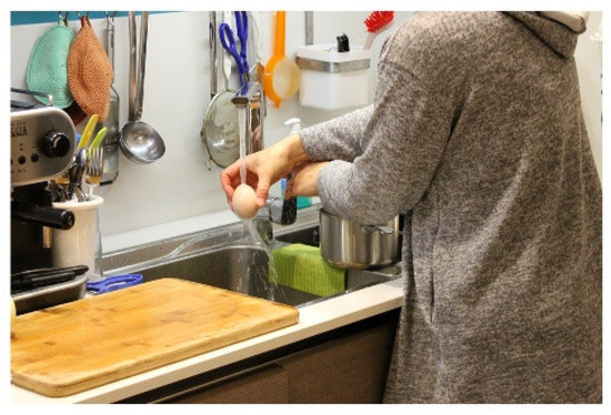 The incorrect washing of the food itself can also promote cross-contamination. For example, various pathogenic microorganisms may be present on the eggshell, including Salmonella and Escherichia coli [61]. Washing eggs is not a correct operation because splashes of contaminated water could contaminate the sink and other kitchen surfaces as well as favour the penetration of microorganisms inside the egg, whose shell is porous (Figure 1).
