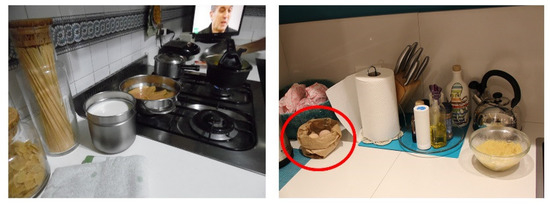 In the kitchen, in addition to the tools useful for the preparation and processing of food, other objects that follow multiple paths of environmental exposure during the day make an appearance: for example, devices such as mobile phones, PCs, chargers, headphones, keys, wallets, and bags that accompany people everywhere in their routine, from public transport to work, the bar, and so on [1,63]. These objects unrelated to food preparation can be vehicles for pathogen microorganisms (Figure 3). In some families, the presence and use of cellular telephones during the preparation of meals, as well as remote controls, computers, tablets, books, games, and bags placed on the ground and then on the table or kitchen surfaces, were observed. Other items such as sprays, garbage buckets, hairpins, and clothespins for hair (Staphylococcus aureus can be present in people’s hair) were placed on the kitchen shelves. The presence of foreign objects unrelated to the handling of food in the kitchen was observed in 11 out of 14 families.
