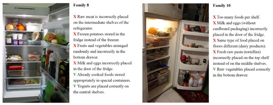 The refrigerator of Family 8 was well organised despite the following critical issues: raw meat incorrectly placed on the intermediate shelves, frozen potatoes stored in the fridge instead of in the freezer, fruit and vegetables arranged randomly and not correctly in the bottom drawer, and milk and egg products incorrectly placed in the door. In the refrigerator of Family 10, food arrangement also appeared to be quite random, and closed packages, open boxes, and plates with leftovers not covered by film were found.