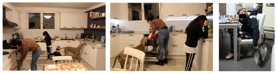 The kitchen is not only the place where food is prepared but also a space in which multiple actors move and act in the area with different purposes (e.g., the mother cooks but at the same time also does homework with her daughter). The kitchen is a multifunctional open space where boundaries are blurred [21]; there is no clear separation between the space in which food is prepared and consumed and the one dedicated to other activities.