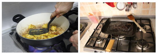 In most families involved, meal preparers did not wash their hands before handling the food or before eating it, and they washed their hands after handling raw animal products such as meat (e.g., hamburgers), chicken breasts, and eggs. Hands were not washed after using the bathroom, sneezing, or blowing the nose and touching/stroking pets, dirty diapers, garbage, or objects unrelated to food preparation (e.g., mobile phones, remote controls, or hair clips dog bowls)—a factor observed in 13 out of 14 families. In several families, during meal preparation, those who prepared it had the habit of rinsing their hands frequently without using detergents. This practice was configured as a routine action and it was not clear when it was essential to do it and, above all, how to do it effectively to stop the possible transmission of pathogens and the consequent contamination of objects (e.g., dishcloths, utensils, or dishes) and foods. Family 1 showed problematic handling practices during the preparation of chicken, which was then fried—a practice that appears simple but requires particular attention to handling: