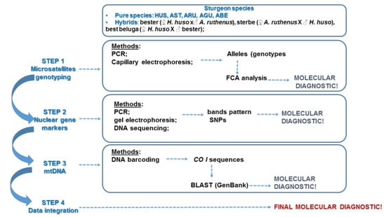 We proposed this multistep DNA-based method for accurate species discrimination in sturgeons in the light of the tremendous efforts that were made in the last decade to identify, test and validate DNA markers for sturgeon identification. The method is based on analyzing both nuclear and mitochondrial markers and integrates the data for the final diagnostic. Each of the proposed markers was also examined for its power in species and hybrid detection on its own. The approach proposed here is based on initially analyzing the nuclear markers that, due to their inheritance pattern, can distinguish between pure species and hybrids. This aspect is essential for various reasons, but mainly because, nowadays, a significant part of aquaculture caviar production is attributed to hybrids.