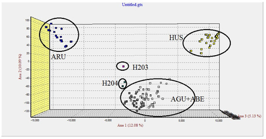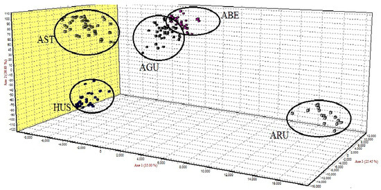 The FCA has emphasized the identification of three pure species based on microsatellite analysis. Three clusters, corresponding to stellate sturgeon (STE), beluga sturgeon (HUS) and sterlet sturgeon (RUT), were identified. Russian sturgeon (AGU) and Siberian sturgeon (ABE) individuals clustered together, as for these two species the diagnostic based on microsatellite analysis was totally ambiguous (Figure 2).
