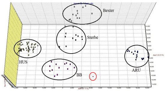 This multilocus approach based on microsatellite analysis has a good power to discriminate between the pure species and hybrids. When an FCA test was run on the genotype data resulting from the analysis of bester, sterbe and best beluga hybrids and their genitor species H. huso and A. ruthenus, the hybrids were differentiated from their genitor species. Moreover, the microsatellites can distinguish best beluga from the other two hybrids. The analyzed individuals of this hybrid produced in aquaculture by back crossing the bester hybrid (♀ H. huso × ♂ A. ruthenus) with one of its genitor species clustered separately from bester and sterbe hybrids. Concerning these two hybrids, unfortunately, the microsatellites do not differentiate between these two F1 hybrids of H. huso and A. ruthenus.