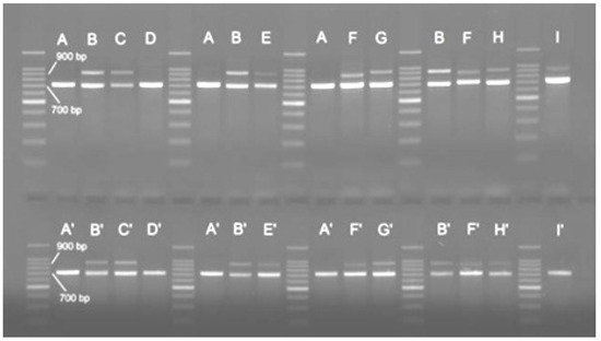 Band patterns given by amplifying the RP1 locus with universal primers. A, A’—H. huso; B, B’—A. ruthenus; C, C’—bester; D, D’—best beluga; E, E’—sterbe; F, F’—A. gueldenstaedtii; G, G’—H203; H, H’—H204; I, I’—A. stellatus. The band size was estimated by using a 100 bp DNA Ladder (Promega).
