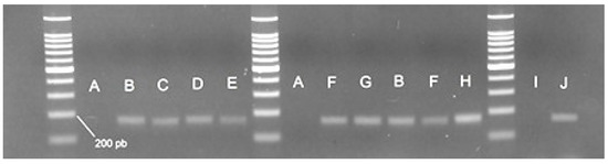 Band patterns given by amplifying the locus vimentin with species-specific primers Bae154B7F/Bae154B7R. A—H. huso; B—A. ruthenus; C—bester; D—best beluga; E—sterbe; F—A. gueldenstaedtii; G—H203; H—H204; I—A. stellatus; J—A. baerii. The band size was estimated by using a 100 bp DNA Ladder (Promega).