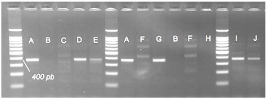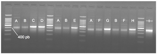 The amplification of this marker with universal primers followed by electrophoresis showed a multiband pattern in the pure species and hybrids, with a 400 bp band present in all cases (Figure 8).