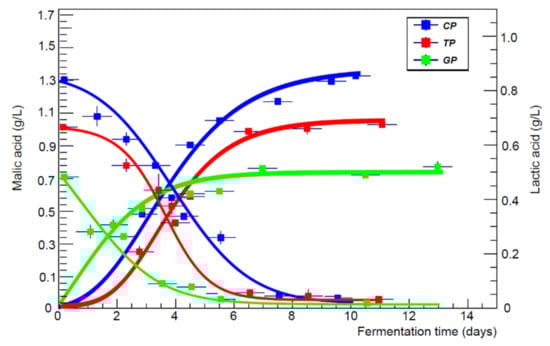 The trend of malic and lactic acid as a function of the fermentation time (days) for all the three plantarum wines.