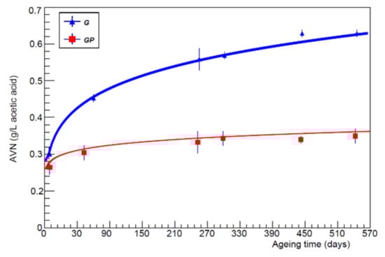 The AVN trend as a function of the aging time (days) for each vineyard and in both protocols.