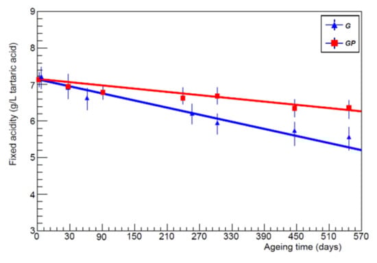 Fixed acidity trend as a function of the aging time (days) for each vineyard and in both protocols.
