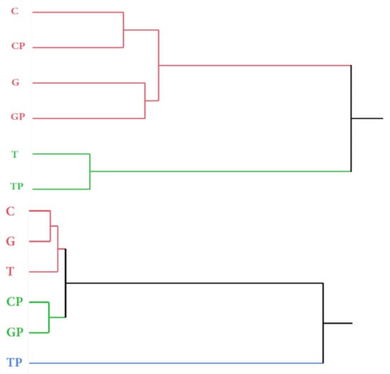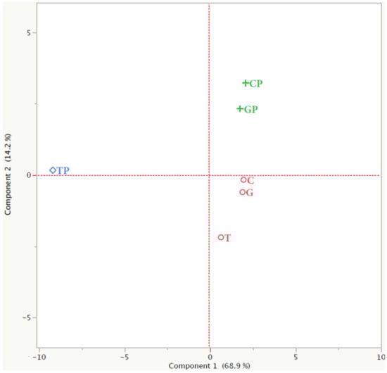 Chemical parameters at racking. C = Castellina, G = Gaiole, T = Tavarnelle, CP = Castellina plantarum, GP = Gaiole plantarum, and TP = Tavarnelle plantarum.