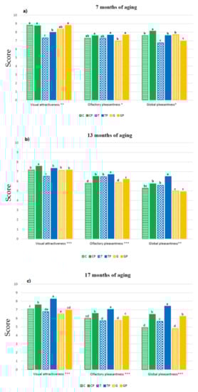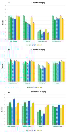Significant quantitative parameters of wines after: (a) 7 months of aging (May 2020), (b) 13 months of aging (November 2020), and (c) 17 months of aging (March 2021). The evaluation was carried out using a score (0–10). Different letters indicate statistically significant differences at p ≤ 0.05 according to the results of two-way ANOVA. Significance level *** p < 0.001, ** p < 0.01; * p ≤ 0.05.