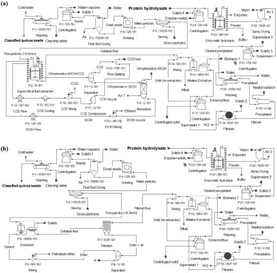 Flowsheets of the (a) supercritical fluids’ extraction (SFE) and (b) conventional solvent extraction (CSE) simulated with SuperPro Designer 9® for QPH production. Source: [18], reproduced with permission from Olivera-Montenegro et al., The 2nd International Electronic Conference on Foods 2021—Future Foods and Food Technologies for a Sustainable World, sciforum-048913; published by MDPI, 2021.
