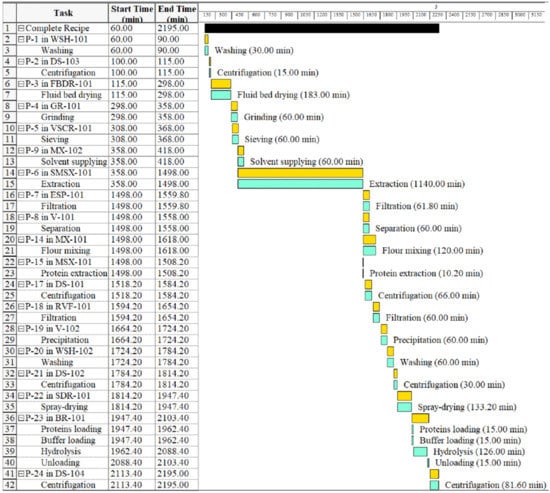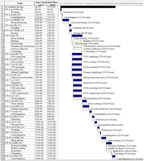 Figure 2 and Figure 3 show industrial operations Gantt charts, illustrating the starting and finishing of an operation in the process of production of QPH using SFE and CSE, respectively. The charts consider a plant for processing 2500 kg of quinoa seeds per day. Operating times for both processes were based on the S/F mass ratios (washing to separate saponins, defatting, protein extraction, and enzymatic hydrolysis). The SFE process includes: a wash tank (P-1/WSH-101), a decanter (P-02/DS-103), a fluid bed dryer (P-03/FBDR-101), a hammer mill (P-04/GR-101), a sieve (P-05/VSCR-101), the quinoa flour is placed in the supercritical CO2 unit (P-06/R-101, P-16/MX-103, P-12/EC-101, P-13/GP-102, P-25/MX-102, P-9/GP-101, P-7/U-101, P-10/FSP-101, P-11/G-101, P-8/C-101), the defatted quinoa is placed in the stirred tank reactor (P-14/MX101, P-15/MSX-101), a decanter (P-17/DE-101), a filter press (P-18/RVF-101), the supernatant is placed in the stirred tank reactor (P-19/V-102), a washing tank (P-20/WHS-102), a decanter (P-21/DS-102), the quinoa protein is placed in the industrial spray dryer (P22/SDR-101), the dry quinoa protein is placed in the stirred tank reactor for enzymatic hydrolysis (P-23/BR-101), and a decanter (P-24/DS-101), until obtaining the quinoa protein hydrolysate.