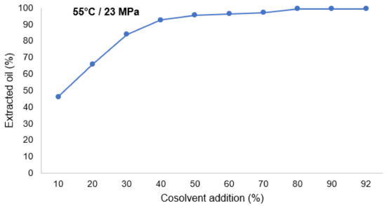 Optimization studies of oil extraction from quinoa flour with SFE using CO2 were performed, and the quinoa flour had an oil content of 7.0%. The seeds were ground with a mill IKA Basic 11, to obtain particle size of ≤0.5 mm. The effect of the cosolvent on the efficiency of oil extraction from quinoa flour was studied by using ethanol in an amount of 10–92% (weight of the cosolvent with respect to weight of the quinoa flour). The best results were obtained for the cosolvent percentage (range up to 90%), as can be seen in Figure 4.