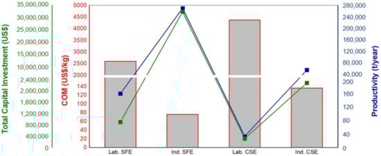 COM, productivity, and total capital investment to produce QPH using SFE and CSE (Lab. SFE: Laboratory supercritical fluids’ extraction; Ind. SFE: Industrial supercritical fluids’ extraction; Lab. CSE: Laboratory conventional solvent extraction; Ind. CSE: Industrial conventional solvent extraction).