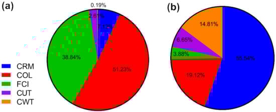 Contribution of each component. CRM: cost of raw material; FCI: fixed capital investment; COL: cost of operational labor; CUT: cost of utilities on the COM for quinoa protein hydrolysate obtained by conventional solvent extraction (CSE) for (a) laboratory scale and (b) industrial scale.