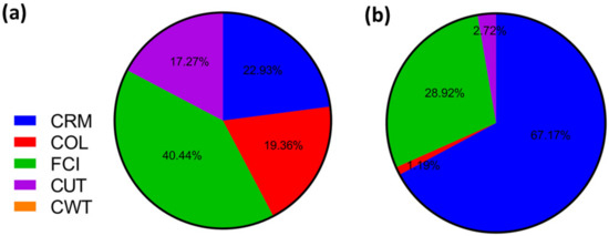 Contribution of each component. CRM: cost of raw material; FCI: fixed capital investment; COL: cost of operational labor; CUT: cost of utilities on the COM for quinoa protein hydrolysate obtained by supercritical fluids; extraction (SFE) for (a) laboratory scale and (b) industrial scale.