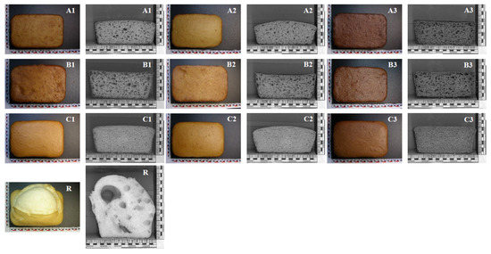 The influence of tef flour incorporation level and variety on the appearance of GF breads. Addition levels: (A): 100 g tef flour per 100 g of mixture; (B): 75 g tef flour per 100 g of mixture; (C): 50 g tef flour per 100 g of mixture; tef varieties: 1: DZ-Cr-37; 2: DZ-Cr-387; 3: DZ-01-99; (R): 100 g/100 g maize starch bread.