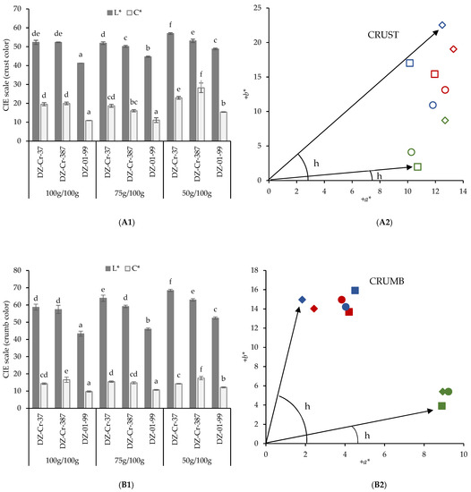 Influence of tef flour addition level and variety on crust (A) and crumb (B) bread color. Crust and crumb lightness and chroma (A1,B1) and hue (A2,B2) of maize starch/tef flour GF breads. Red symbols represent breads made with the DZ-Cr-37 variety, blue symbols the DZ-Cr-387 variety and green symbols, the breads made with DZ-01-99 variety. Squares represent the 100 g/100 g dose, circles represent the 75 g/100 g dose and diamonds, the 50 g/100 g dose. The hue of the indicated samples (located at extreme angular positions in the chromatic diagram) is represented by the angle identified as h. In Figures (A1) or (B1) columns of the same series with a letter in common correspond to values that are not significantly different (p > 0.05).