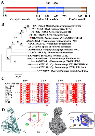F. algicola 12,076 can grow in medium with fucoidan as the sole carbon source (data not shown), which suggested that this strain can secrete some enzymes that are involved in fucoidan degradation. Previous studies have shown that the strain type F. algicola TC2T [30] could digest the GA-fucoidan extracted Laminaria japonica. Recently, several enzymes that are involved in the carrageenan metabolism pathway and α-L-fucosidase with transfucosylation activity have been discovered, verified, and analyzed in F. algicola [31,32]. However, the enzymes and genes that are responsible for fucoidan degradation in this fucoidan-digesting strain have not been reported. A novel gene encoding a putative fucoidanase OUC-FaFcn1 (OL739608) was cloned from the genome DNA of F. algicola 12076. The open reading frame of the fucoidanase gene has 3045 bp and encodes a protein with 1014 amino acid residues. The predicted molecular mass is about 111.4 kDa and there is a signal peptide consisting of 31 amino acids in its N-terminus. Modular architecture analysis revealed the presence of various module types of this putative fucoidanase OUC-FaFcn1 (Figure 1A), including a 415-residue-long N-terminal domain, three successive repeated Cadherine-like and Immunoglobulin(Ig)-like fold domains, and a 67-amino acid-long secretion system C-terminal protein domain (Por-Secre-tail), which is similar to most members that are recorded in the GH107 family except for P19DFcnA and P5AFcnA that only contain an N-terminal catalytic domain. Among them, the N-terminal domain is the catalytic region, the Ig-like fold domains play a huge part in the soluble expression of proteins, and the C-terminal Por-Secre-tail is involved in outer membrane sorting and covalent modification. Phylogenetic analysis (Figure 1B) showed that OUC-FaFcn1 belongs to the GH107 family and the protein sequence similarity between OUC-FaFcn1 to fucoidanase MfFcnA is 59.01%. These results proved OUC-FaFcn1 is a novel fucoidanase in the GH107 family. Multi-sequence alignment suggested that OUC-FaFcn1 is highly conservative at the active sites of Asp231 and His298 (Figure 1C), which act as catalytic nucleophile and acid/base residue, respectively [24]. By comparing the protein structure of MfFcnA4 (PDB: 6dlh) and MfFcnA9 (PDB: 6dns), OUC-FaFcn1 shares 62.22% and 44.83% structural identities with these two fucoidanases, respectively. The results of the molecular docking simulation between OUC-FaFcn1 and α-L-fucopyranosyl-2-sulfate shows that Asp231 combines with the substrate by hydrogen bond interactions, and His298 acts as an acid-base catalytic action (Figure 1D), which was consistent with that of the novel fucoidanase Fhf2 [26]. A groove on the surface forms a basic pocket that can accommodate and bind to sulphate groups. Thus, the sulfation pattern of fucoidan may play a major role in its recognition of enzymes. This further demonstrated the feasibility of OUC-FaFcn1 in degrading fucoidan.