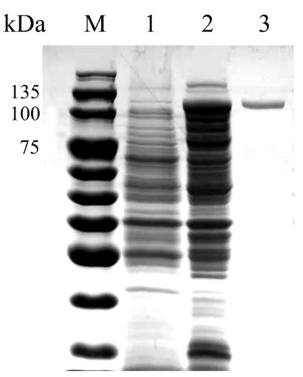The host cells of E. coli possessing the vector pET-28a(+)-OUC-FaFcn1 were cultivated in ZYP-5052 medium for successful expression of OUC-FaFcn1. After extraction, separation, and purification, a single and clear band of 110 kDa was observed by SDS-PAGE (Figure 2), which is consistent with the result of the theoretical Mw that was calculated from its protein sequence without signal peptide. The Mw of the purified OUC-FaFcn1 is roughly equal to other fucoidanases in GH107 family, such as MfFcnA (105 kDa), FFA1 (111 kDa), and Fp273 (105 kDa), but except P19DFcnA (45.3 kDa) and P5AFcnA (45.2 kDa). The fucoidan-hydrolyzing activity of OUC-FaFcn1 was measured by the pHBH approach, and its specific activity was 4.11 U/mg. Comparing to crude enzymes from 1 L culture broth, the purification fold and the enzyme recovery yield was 3.29 and 59.32%, respectively (Table 1). Generally, fucoidanases possess relatively low activities and only a little research has described the specific activity of fucoidanase. For example, Tatsuhiko [35] researched the ability of fucoidanase from Luteolibacter algae H18 towards deacetylated fucoidan, and its activity was 3.18 U/mg. The activity of fucoidanase FcnA from W. fucanilytica CZ1127T against fucoidan that was extracted from sea cucumbers I. badionotus was 13.7 U/mg [29]. Whereas the activities of other fucoidanases are mostly determined by qualitative determination of products [23,24,25,26,27]. However, the fucoidanase activity is closely related to the source and structure of the substrate fucoidan.