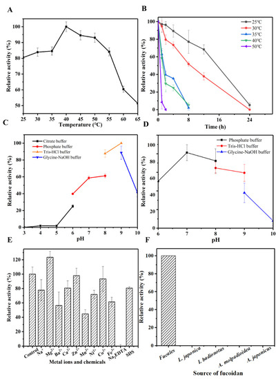 The optimum reaction temperature was measured through incubating the reaction mixtures containing 30 μL of the purified OUC-FaFcn1 and 270 μL fucoidan solutions at different temperatures including 25, 30, 35, 40, 45, 50, 55, 60, and 65 °C for 30 min. The relative activity of the OUC-FaFcn1 at the optimum reaction temperature was regarded as 100%. The thermostability of OUC-FaFcn1 was measured by incubating it in the range of 25–50 °C for 48 h, and then tested the residual activity. The enzyme activity was measured following the procedures that are described above.