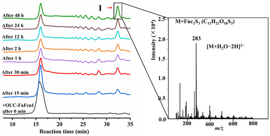 Afterwards, the principal product Ⅰ was separated and analyzed by ESI-MS and the results in Figure 4 revealed that the corresponding m/z of product Ⅰ was 283 as [M + H2O-2H]2−, which was a disaccharide carrying three sulfate groups (Fuc2S3). The principal product of OUC-FaFcn1 is distinct from that which is produced by other fucoidanases in the GH107 family. For example, both MfFcnA [21] and FFA2 [23] can degrade fucoidan into the final products of tetrasaccharide and hexasaccharide, tetrasaccharide is the principal final product of FAA1 [22] and FWf1 [27], the principal products of Fhf1 [25] include tetrasaccharide, octasaccharide, and decasaccharide, wheread tetrasaccharide, hexasaccharide, and octasaccharide make up the dominating products of FWf2 [27]. To the best of our knowledge, OUC-FaFcn1 is the only biotechnological tool that is available for disaccharide preparation from fucoidan. Commonly, the difference in the degree of product polymerization is related to the minimum identification unit of the enzyme to its substrate. Therefore, it is speculated that the unique products composition that is dominated by disaccharide of the OUC-FaFcn1 is attributable to its smaller recognition substrate.