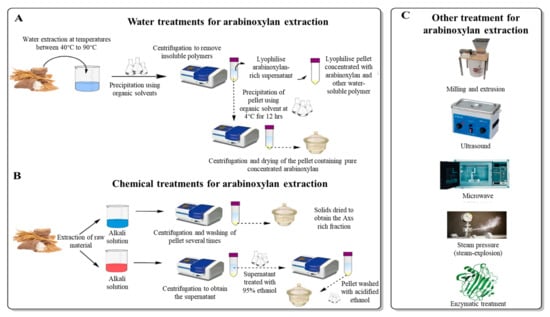 Schematic illustration of a water treatment approach (A) to extract AXs from cereal grains. (B) demonstrates a different approach using acidic or basic chemical solutions to extract AXs. Other treatments (C), including mechanical (milling and extrusion, steam-pressure, ultra-sound, microwave) and enzymatic treatments, are also included.