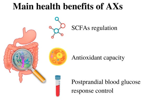 An important variable to consider with the in vivo studies is the initial microbiota of the participants. A microbial community that lacks essential bacterial species involved in the breakdown of complex polysaccharides is likely to be less efficient at degrading these polymers [], influencing the studies’ outputs. This was proven by Wu et al. [], who found entirely different results for groups with different geographical locations. However, despite all this, there is a clear consensus regarding the main beneficial effects of AXs []. These are as follows (Figure 2):