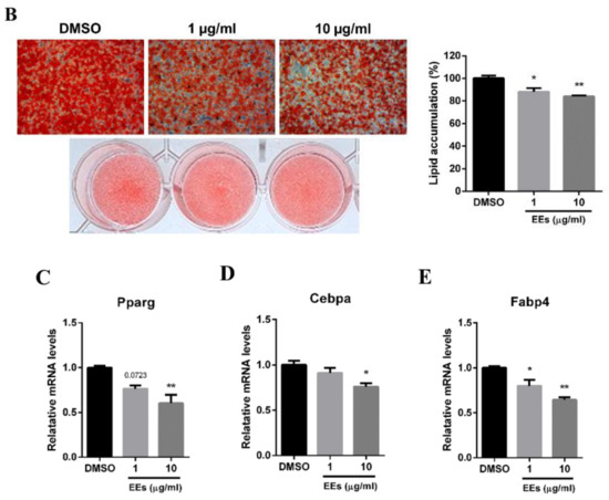 Non-cytotoxic concentrations of EEs in mIPA were observed at 1 and 10 μg/mL through cell viability assays (Figure S1A). To study the effect of EEs on the differentiation of mouse white adipocytes, cells were treated with EEs (1 and 10 μg/mL) every two days for six days during mIPA differentiation (Figure 1A). ORO staining of differentiated mIPA showed significantly decreased lipid accumulation in the 10 μg/mL EEs-treated group compared to the untreated control group (Figure 1B, p < 0.01). Additionally, expression levels of adipogenic genes, including Pparg, Fabp4 (p < 0.01), and Cebpa (p < 0.05), were inhibited by EEs in a dose-dependent manner (Figure 1C–E).